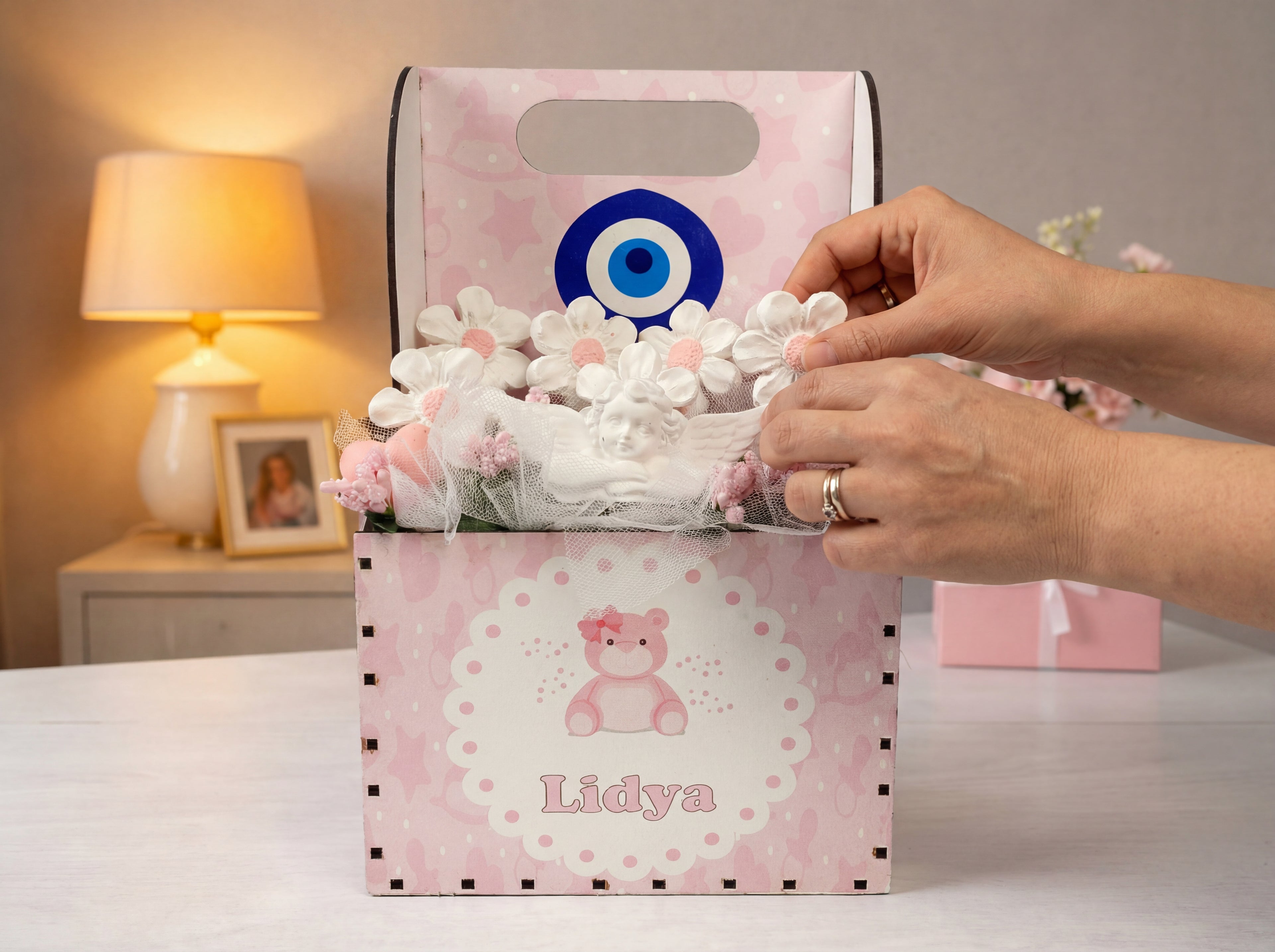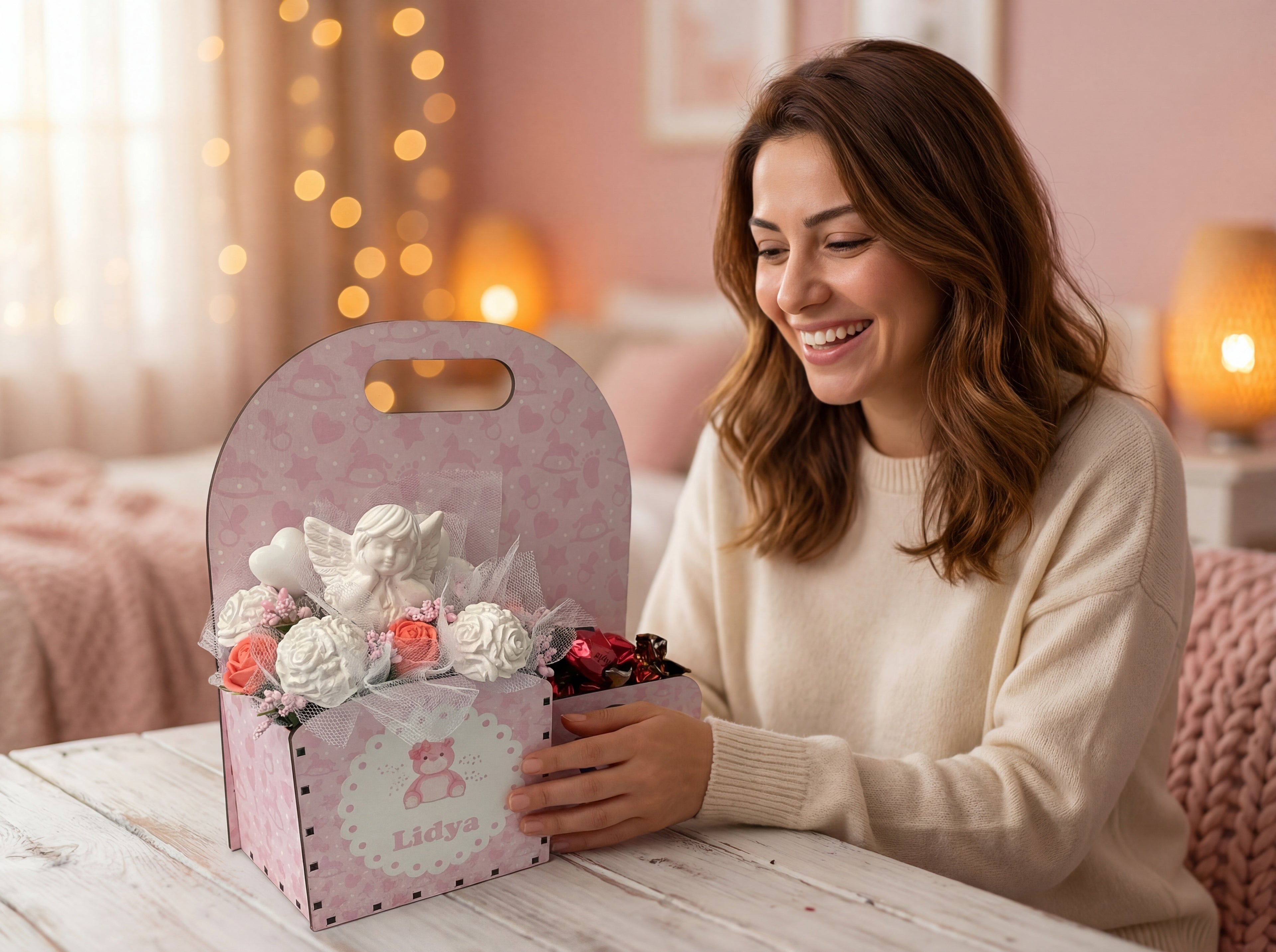 Tüm sepetler lazer kesim MDF ahşaptan üretilmektedir. İçindeki çiçekler alçı ve kumaş malzemeden, melek figürleri seramik alçıdan yapılmıştır.